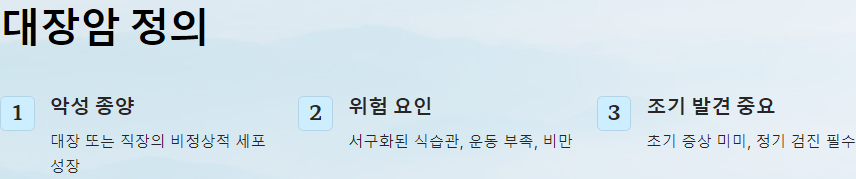 대장암은 대장 또는 직장에 발생하는 악성 종양으로, 대장 내의 세포가 비정상적으로 성장하여 발생합니다. 대장암은 일반적으로 서구화된 식습관, 운동 부족, 비만 등과 관련이 깊습니다. 대장암은 초기에는 증상이 거의 없기 때문에, 정기적인 검진이 매우 중요합니다.