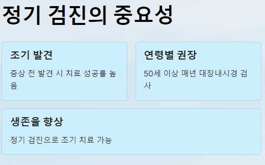 대장암은 조기 발견 시 치료가 가능하지만, 증상이 나타났을 때는 이미 진행된 경우가 많습니다. 따라서 정기적인 검진이 필수적입니다. 특히 50세 이상의 성인은 매년 대장내시경 검사를 받는 것이 좋습니다.