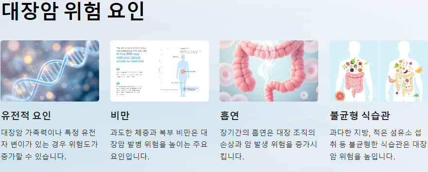 - 식습관 : 고지방, 저섬유질 식단은 대장암의 위험을 증가시킵니다.