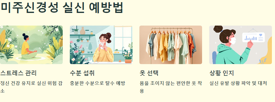 미주신경성 실신을 예방하기 위해서는 몇 가지 생활 습관을 개선하는 것이 중요합니다. 스트레스를 관리하고, 탈수를 피하며, 충분한 수분을 섭취하는 것이 좋습니다. 또한, 몸을 조이는 옷은 피하고, 실신이 유발될 수 있는 상황을 미리 인지하여 대처하는 것이 필요합니다.