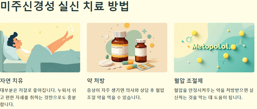 미주신경성 실신은 대개 특별한 치료가 필요하지 않지만, 증상이 반복되는 경우에는 약물 치료를 고려할 수 있습니다. 가장 흔히 사용되는 약물은 메토프롤롤과 같은 베타 차단제입니다. 이 약물은 혈압을 안정시키고 실신을 예방하는 데 도움을 줄 수 있습니다.