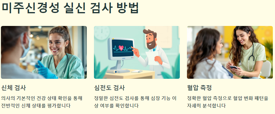 미주신경성 실신을 진단하기 위해서는 여러 가지 검사가 필요할 수 있습니다. 의사는 환자의 병력과 증상을 바탕으로 신체 검사를 실시하고, 필요에 따라 심전도 검사나 혈압 측정을 진행할 수 있습니다. 이러한 검사를 통해 다른 심각한 질환이 아닌지 확인하는 것이 중요합니다.