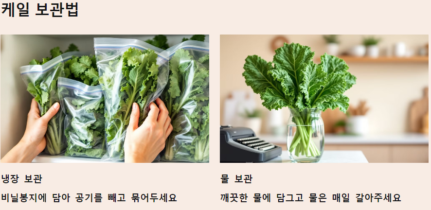 - 냉장 보관 : 케일은 냉장고의 채소 칸에 보관하는 것이 좋습니다. 비닐봉지에 넣어 공기를 빼고 밀봉하여 보관하세요.
