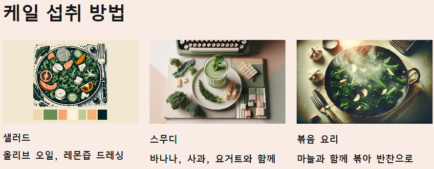 - 샐러드 : 신선한 케일을 잘 씻어 샐러드로 즐길 수 있습니다. 올리브 오일과 레몬즙을 뿌려 간단하게 드레싱을 만들어 보세요.