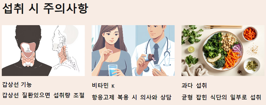 케일은 건강에 많은 이점을 제공하지만, 과다 섭취 시 주의해야 할 점도 있습니다. 특히 갑상선 기능에 영향을 줄 수 있으므로, 갑상선 질환이 있는 분들은 섭취량을 조절해야 합니다. 또한, 케일은 비타민 K가 풍부하므로, 항응고제를 복용 중인 분들은 의사와 상담 후 섭취하는 것이 좋습니다.