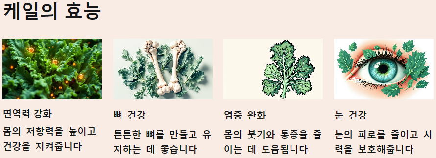 - 소화 개선 : 케일은 식이섬유가 풍부하여 장 건강에 도움을 주고, 변비 예방에도 효과적입니다.