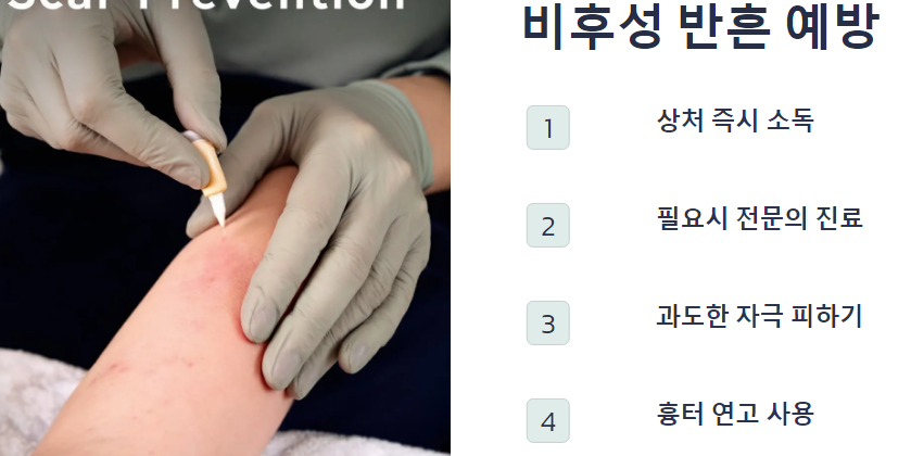 비후성 반흔을 예방하기 위해서는 상처를 적절히 관리하는 것이 중요합니다. 상처가 생겼을 때는 즉시 소독하고, 필요시 전문의의 진료를 받는 것이 좋습니다. 또한, 상처가 아물 때까지는 과도한 자극을 피하고, 흉터 연고를 사용하는 것이 도움이 됩니다.