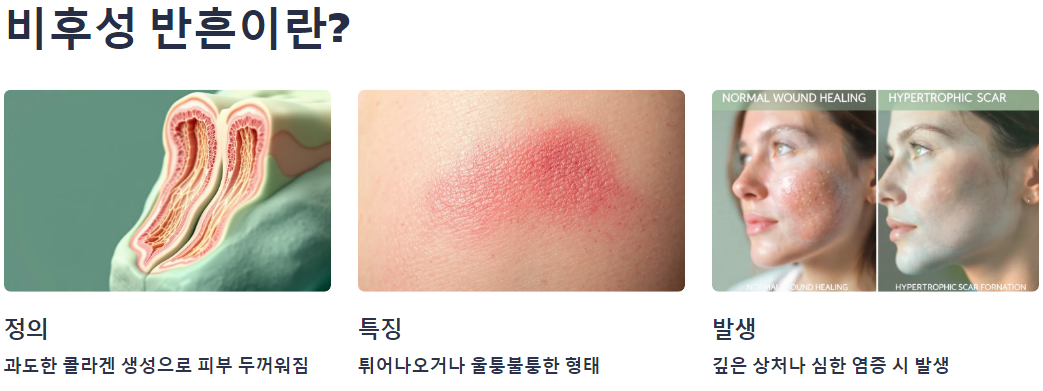 비후성 반흔은 피부의 상처가 치유되는 과정에서 과도한 콜라겐이 생성되어 피부가 두꺼워진 상태를 말합니다. 일반적으로 상처가 치유되면서 생기는 흉터는 평평하게 남지만, 비후성 반흔은 피부가 튀어나오거나 울퉁불퉁하게 변형됩니다. 이러한 반흔은 주로 상처가 깊거나 염증이 심한 경우에 발생합니다.