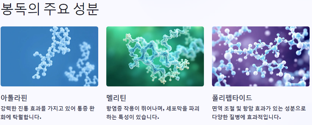 봉독은 꿀벌이 방어를 위해 주입하는 독으로, 주로 단백질, 아미노산, 효소 등으로 구성되어 있습니다. 이 성분들은 인체에 여러 가지 긍정적인 영향을 미칠 수 있습니다. 특히, 봉독은 한방에서 오랜 역사를 가지고 있으며, 다양한 질병 치료에 사용되어 왔습니다.