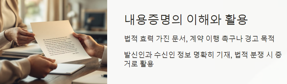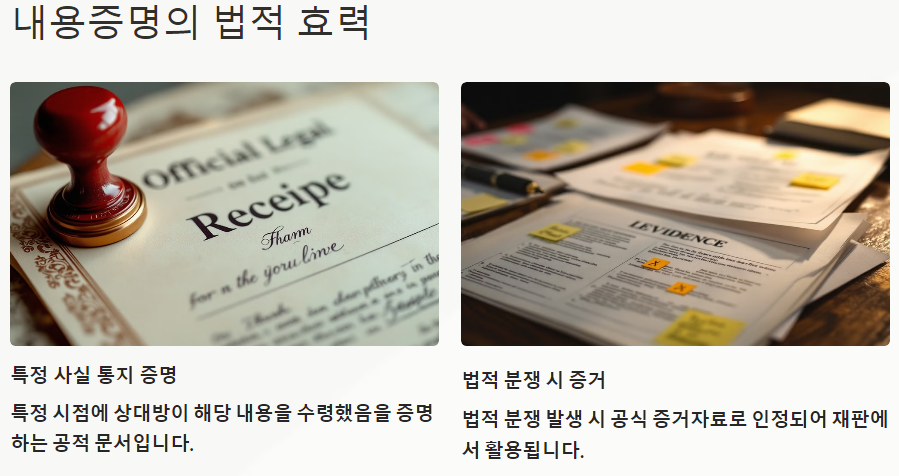 내용증명은 법적 효력을 가지며, 상대방에게 특정 사실을 통지했음을 증명할 수 있습니다. 예를 들어, 계약 이행을 촉구하는 내용증명을 보냈다면, 상대방이 이를 수령했음을 입증할 수 있습니다. 이는 향후 법적 분쟁에서 중요한 증거로 작용할 수 있습니다.