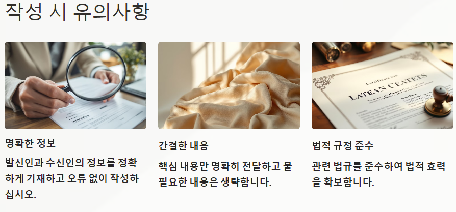 - 법적 규정 준수 : 내용증명은 법적 문서이므로, 관련 법규를 준수하여 작성해야 합니다.