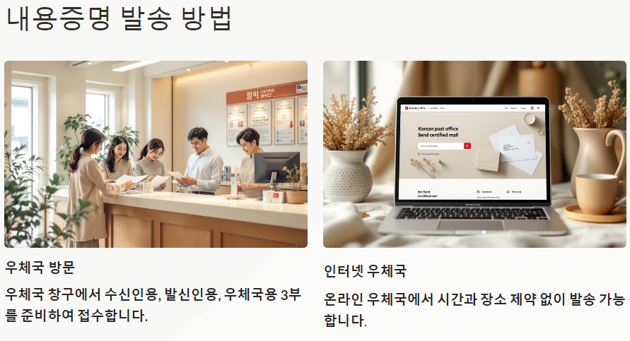 - 인터넷 우체국 이용 : 인터넷 우체국을 통해 간편하게 내용증명을 보낼 수 있습니다. 인터넷 우체국에 접속하여 '우편' - '증명서비스' - '내용증명' 메뉴를 선택한 후, 필요한 정보를 입력하고 발송하면 됩니다.