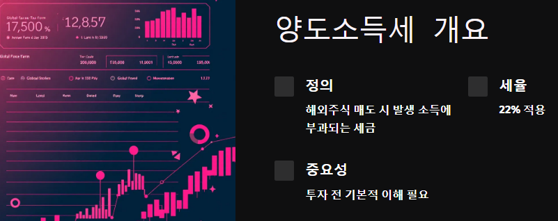 해외주식 양도소득세란 외국 주식을 매도(양도)했을 때 발생하는 소득에 대해 부과되는 세금입니다. 한국의 세법에 따르면, 해외주식에서 발생한 양도소득은 22%의 세율이 적용됩니다. 이를 통해 국세청은 해외주식으로 인한 소득을 과세하게 됩니다.