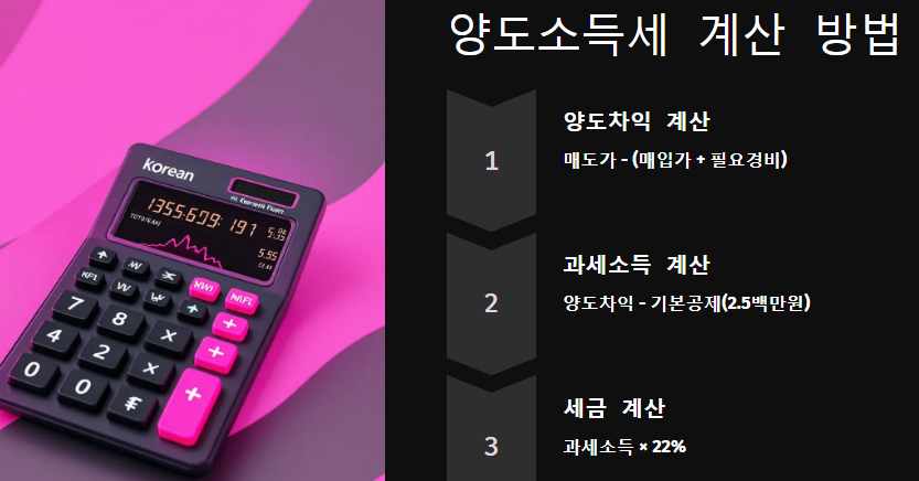 양도소득세를 계산할 때는 먼저 매도 가격과 매입 가격을 알아야 합니다. 매도 가격에서 매입 가격과 필요 경비를 차감한 후, 2.5백만원의 기본 공제를 적용하여 과세 소득을 계산합니다.