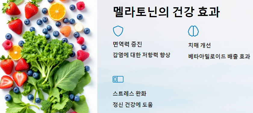 멜라토닌은 수면의 질을 향상시키고, 불면증을 완화하는 데 도움을 줍니다. 또한, 멜라토닌은 항산화 작용이 있어 세포 손상을 방지하고, 면역 체계를 강화하는 데 기여할 수 있습니다. 최근 연구에 따르면, 멜라토닌은 베타아밀로이드 배출 효과 및 치매 개선 효과도 있는 것으로 알려져 있습니다.