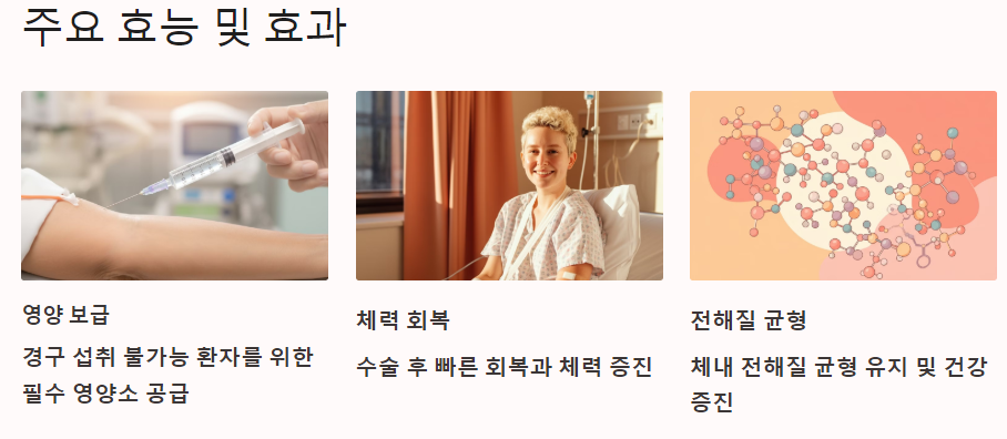 영양 보급 : 경구 또는 위장관 영양 공급이 불가능한 환자에게 필수 영양소를 제공합니다.
