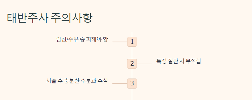태반주사를 고려하고 있다면 몇 가지 주의사항이 있습니다. 첫째, 임신 중이거나 수유 중인 여성은 시술을 피하는 것이 좋습니다. 둘째, 특정 질환이 있는 경우에는 시술이 적합하지 않을 수 있으므로, 반드시 의사와 상담해야 합니다. 셋째, 시술 후에는 충분한 수분 섭취와 휴식이 필요합니다.