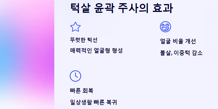 턱살 윤곽 주사를 통해 얻을 수 있는 효과는 다양합니다. 첫째, 턱선이 더욱 뚜렷해지고 매력적인 얼굴형을 만들 수 있습니다. 둘째, 볼살이나 이중턱이 감소하여 전체적인 얼굴 비율이 개선됩니다. 셋째, 시술 후 빠른 회복이 가능하여 일상생활에 큰 지장을 주지 않습니다.