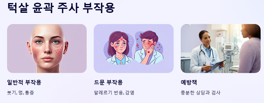 모든 시술에는 부작용이 따를 수 있습니다. 턱살 윤곽 주사도 예외는 아닙니다. 일반적인 부작용으로는 붓기, 멍, 통증 등이 있으며, 드물게 알레르기 반응이나 감염이 발생할 수 있습니다. 따라서 시술 전 충분한 상담과 검사를 받는 것이 중요합니다.