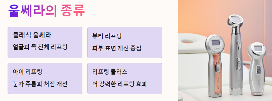 울쎄라는 비침습적인 방법으로 피부를 리프팅하고 탄력을 개선할 수 있는 효과적인 시술입니다. 다양한 종류의 울쎄라는 각각의 피부 상태와 필요에 맞추어 최적화된 효과를 제공합니다. 그러나 모든 시술이 그렇듯이, 개인의 피부 상태와 필요에 따라 효과가 다를 수 있으며, 부작용이 발생할 수도 있습니다.