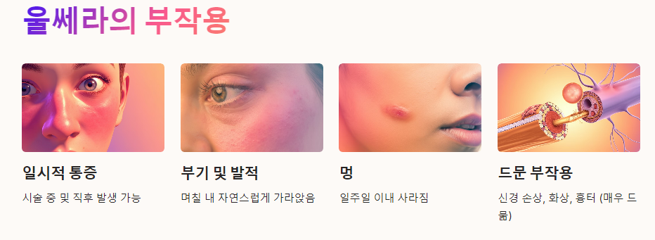 울쎄라는 대체로 안전한 시술로 알려져 있지만, 일부 부작용이 발생할 수 있습니다. 시술 후 나타날 수 있는 부작용으로는 다음과 같은 것들이 있습니다.