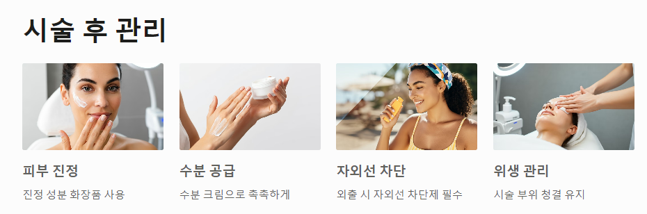 - 피부 진정: 시술 후 피부가 민감해질 수 있으므로, 진정 성분이 함유된 화장품을 사용해 피부를 진정시켜주는 것이 좋습니다.
