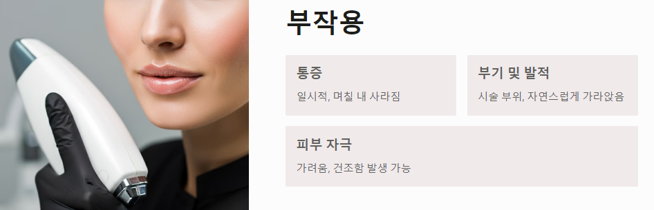 - 부기 및 발적: 시술 부위에 부기나 발적이 발생할 수 있으며, 이는 보통 몇 시간에서 며칠 내에 자연스럽게 가라앉습니다.