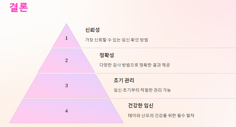 산부인과 임신검사는 임신 여부를 정확히 확인하고, 초기부터 적절한 관리를 받을 수 있는 가장 신뢰할 수 있는 방법입니다. 다양한 검사 방법과 정확한 결과를 통해 임신 초기의 중요한 정보를 얻을 수 있으며, 태아와 산모의 건강을 위해 반드시 필요한 절차입니다. 산부인과 임신검사를 통해 건강한 임신과 출산을 준비하시길 바랍니다.