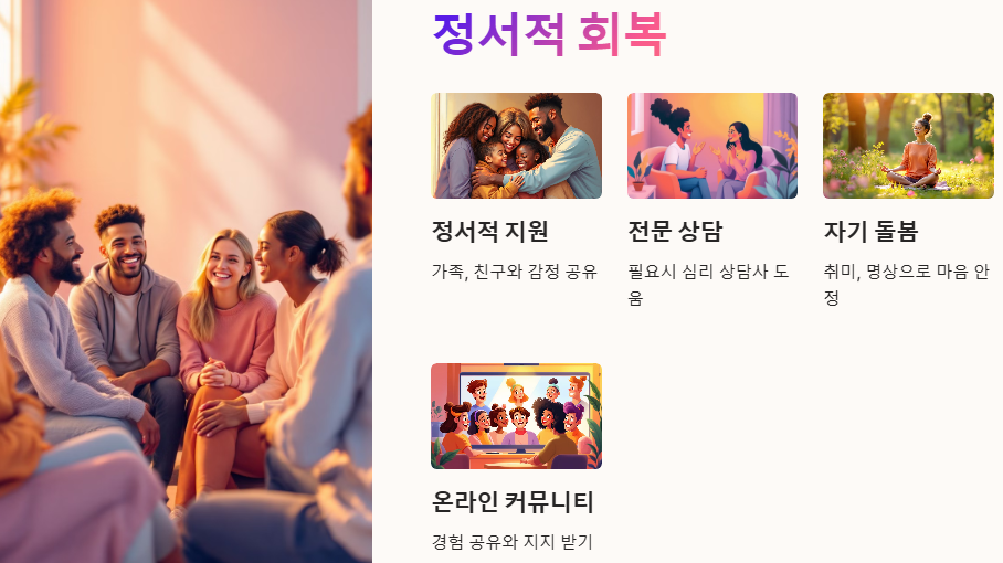 - 전문 상담: 필요할 경우 심리 상담사나 정신건강 전문가의 도움을 받는 것도 좋습니다. 전문가의 지지를 통해 감정을 이해하고, 긍정적인 방법으로 극복할 수 있습니다.