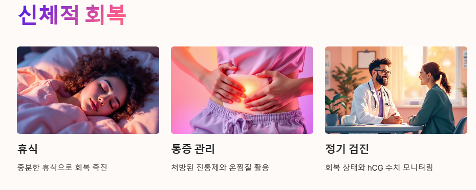 - 정기 검진: 정기적으로 산부인과를 방문하여 회복 상태를 확인받고, 합병증을 조기에 발견하여 치료합니다. 특히, hCG 수치를 지속적으로 모니터링하여 자궁외임신이 완전히 해결되었는지 확인합니다.