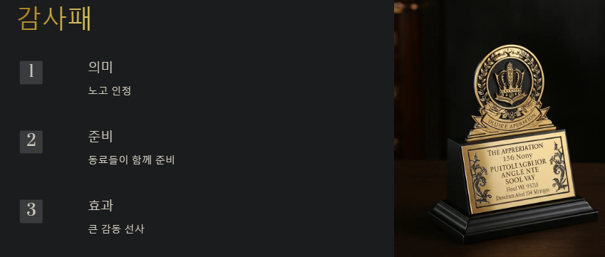 퇴직 후의 소중한 순간들을 담을 수 있는 기념 액자는 좋은 선택입니다. 가족이나 동료들과의 사진을 담아두면, 퇴직 후에도 그 순간들을 회상하며 행복한 기억을 떠올릴 수 있습니다.