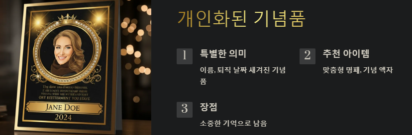 개인화된 기념품은 퇴직하는 분에게 특별한 의미를 부여합니다. 이름이나 퇴직 날짜가 새겨진 기념품은 그 분의 경력을 기념하는 데 큰 도움이 됩니다. 예를 들어, 맞춤형 명패나 기념 액자는 퇴직 후에도 소중한 기억으로 남을 것입니다.