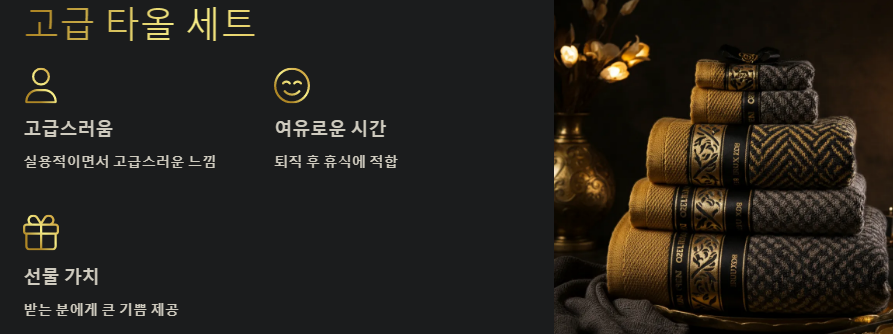 고급 타올 세트는 실용적이면서도 고급스러운 느낌을 주는 선물입니다. 퇴직 후 여유로운 시간을 보내는 데 필요한 아이템으로, 고급스러운 디자인의 타올 세트는 받는 분에게 큰 기쁨을 줄 것입니다.