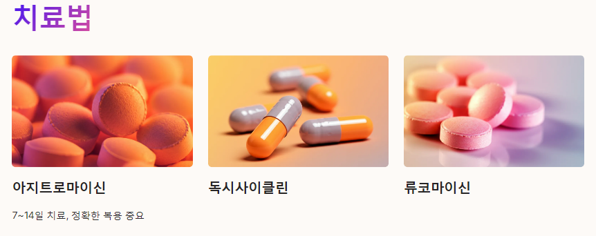 항생제 치료는 보통 7~14일 정도 소요되며, 정확한 복용법을 따르는 것이 중요합니다. 증상이 개선되더라도 치료 기간을 모두 완료해야 합니다.