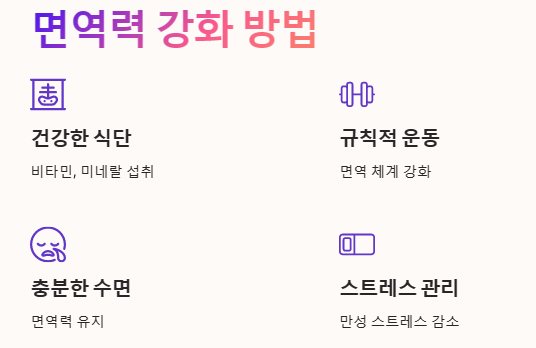 • 충분한 수면: 수면 부족은 면역력을 약화시킬 수 있으므로, 충분한 수면을 취하는 것이 중요합니다.