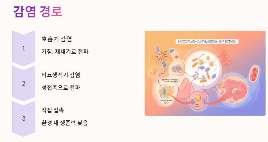 마이코플라즈마는 환경 내에서 오랫동안 생존할 수 없기 때문에 직접적인 접촉이 주된 감염 경로입니다. 또한, 면역 체계가 약해진 상태에서는 감염이 더 쉽게 일어날 수 있습니다.