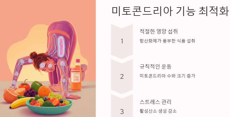 미토콘드리아의 기능을 최적화하기 위해서는 다음과 같은 방법을 고려할 수 있습니다: