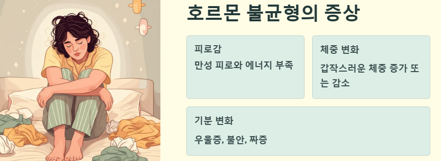 호르몬 불균형은 만성 피로와 에너지 부족을 유발할 수 있습니다. 갑상선 호르몬이 부족하면 신진대사가 느려져 피로감이 심해질 수 있습니다.