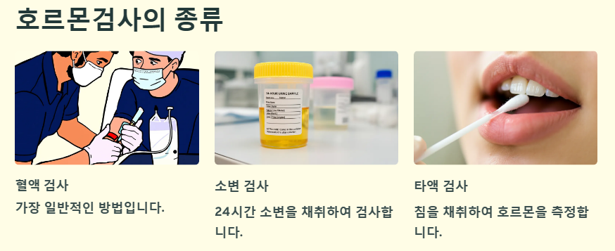 혈액 검사, 소변 검사 또는 타액 검사를 통해 호르몬 수치를 측정합니다. 검사는 일반적으로 빠르고 간단하게 진행됩니다.