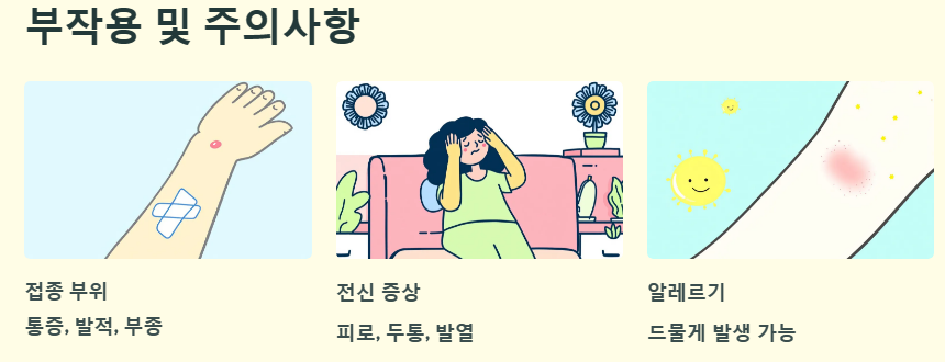 - 피로, 두통: 일부 사람들은 접종 후 피로감이나 두통을 느낄 수 있습니다.