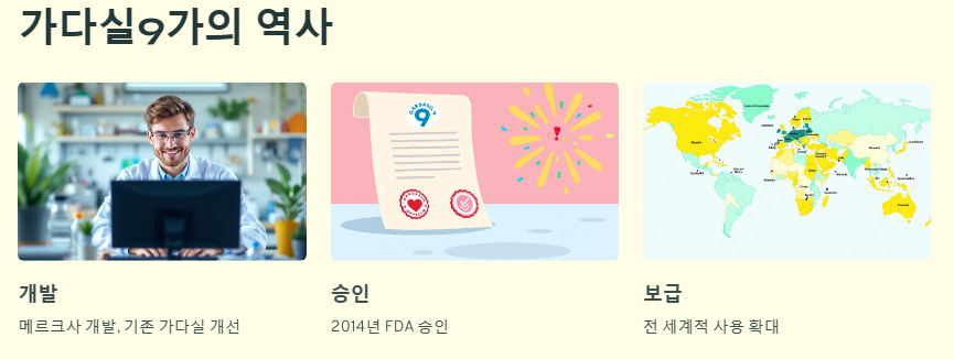 가다실9가는 제약회사 메르크(Merck)에 의해 개발되었습니다. 초기의 가다실 백신은 4가지 유형의 HPV를 예방할 수 있었지만, 이를 개선하여 더 많은 HPV 유형을 예방할 수 있도록 가다실9가가 개발되었습니다. 가다실9가는 2014년에 미국 식품의약국(FDA)의 승인을 받았으며, 이후 전 세계적으로 사용되고 있습니다.
