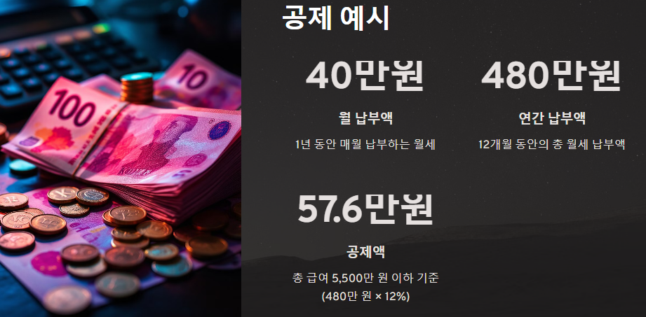 • 공제액(총 급여 5,500만 원 이하): 480만 원 × 12% = 57만 6천 원