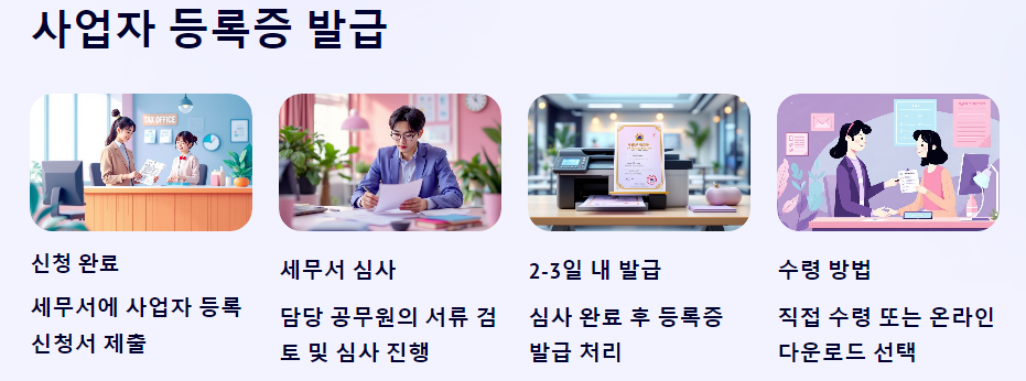 사업자 등록 신청을 완료하면, 세무서에서 심사를 거친 후 사업자 등록증을 발급합니다. 사업자 등록증은 보통 신청한 지 2~3일 이내에 발급됩니다. 세무서에서 직접 발급받거나, 홈택스를 통해 전자적으로 다운로드할 수 있습니다. 발급된 사업자 등록증은 사업을 공식적으로 시작할 수 있는 증빙 서류입니다.
