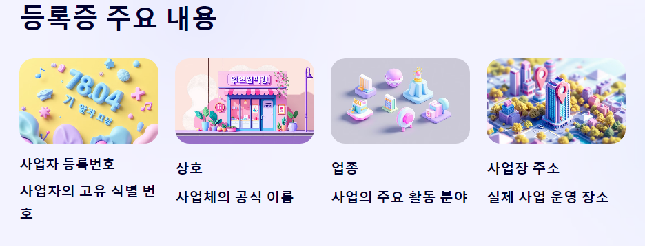 사업자 등록증에는 사업에 관한 중요한 정보들이 담겨 있습니다. 이 정보를 통해 사업의 성격과 사업자가 정확히 무엇을 하는지 확인할 수 있습니다. 사업자 등록증에 포함되는 주요 내용은 다음과 같습니다: