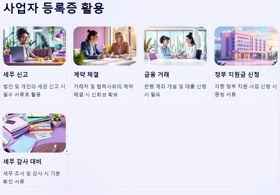 사업을 운영하면서 세무 감사나 세무 검사를 받을 때도 사업자 등록증은 중요한 증빙 서류로 활용됩니다. 세무서에서 요구하는 서류를 제출할 때 사업자 등록증은 사업자임을 증명하는 중요한 자료로 사용됩니다.