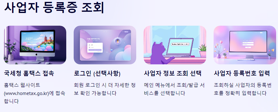 사업자 등록증을 조회하려면 국세청 홈택스에서 제공하는 사업자 정보 조회 서비스를 이용하면 됩니다. 이 서비스는 사업자가 공개된 정보를 조회할 수 있는 기능으로, 사업자등록번호를 알고 있으면 누구든지 간편하게 조회할 수 있습니다.