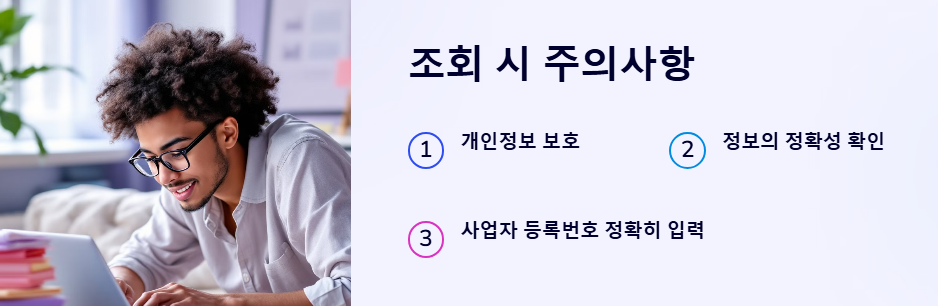 사업자 등록증 조회는 매우 유용하지만, 몇 가지 주의사항도 존재합니다:
