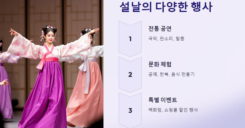 • 전통 공연: 설날을 맞아 전통 음악과 춤을 감상할 수 있는 공연들이 곳곳에서 열립니다. 국악, 판소리, 탈춤 등 전통 예술 공연은 관객들에게 한국의 아름다움을 선사합니다.