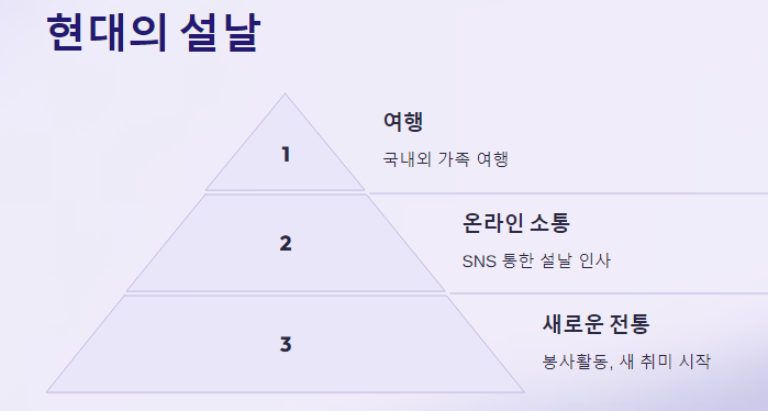 • 여행: 가족과 함께 국내외로 여행을 떠나 새로운 장소에서 설날을 보내는 경우가 많아졌습니다. 설 연휴를 이용해 여행을 떠나는 가족들은 새로운 환경에서 색다른 경험을 하며 설날을 즐깁니다.