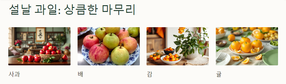 과일은 설날에 상큼한 맛을 더해주며, 가족들과 함께 과일을 나누어 먹는 시간이 즐거운 설날을 만들어줍니다.